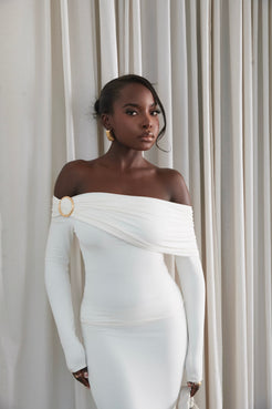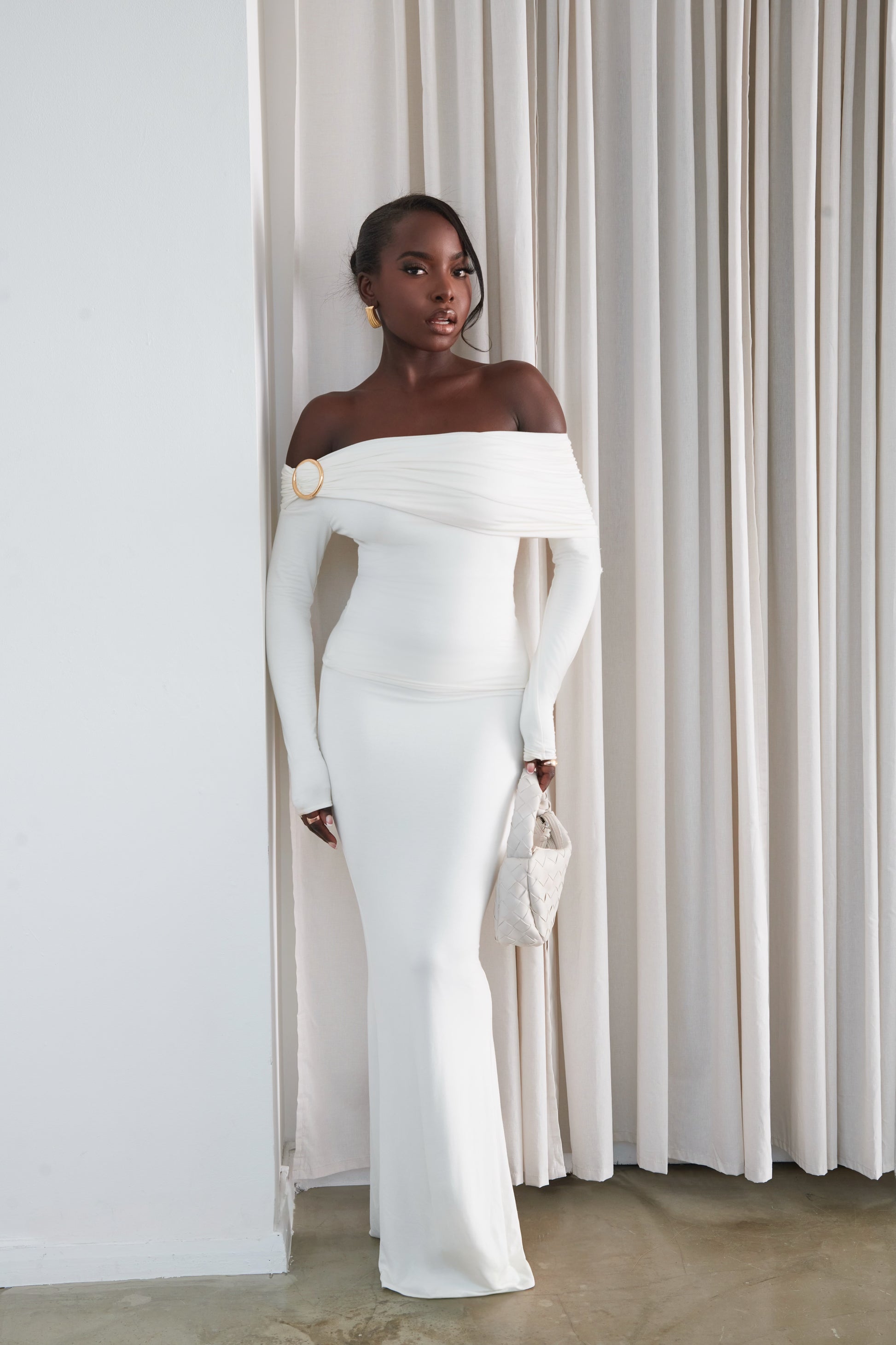 Two pieces, one soft statement. Our Solae Bardot Set combines a figure-hugging maxi skirt with a structured off-the-shoulder top. Finished with a subtle statement gold buckle, designed to highlight the décolletage.